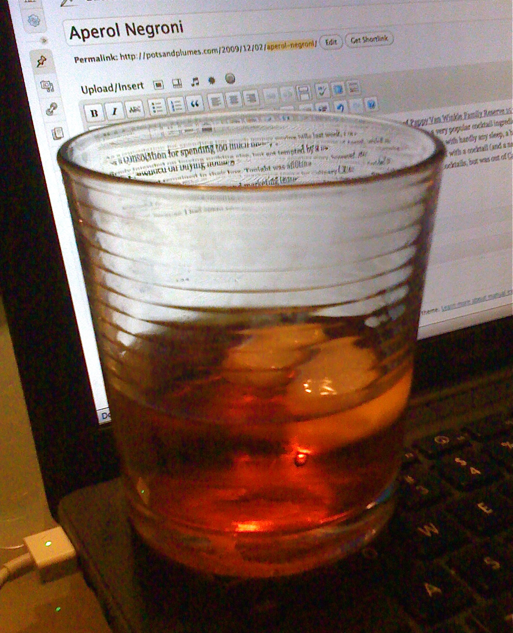As a consolation for spending too much money paying bills, I ordered a bottle of Pappy Van Winkle Family Reserve 15 years last week. I firmly intended on buying nothing else, but got tempted by a bottle of Aperol, which has become a very popular cocktail ingredient. Both arrived yesterday but remained in their box. Tonight was another story, however: After a harrowing few days with hardly any sleep, a big deadline met, a successful meeting with the PR and marketing teams for Culinary Careers, I decided to reward myself with a cocktail (and a nap). I wanted to make a Negroni, because I spent time researching and writing about that and a couple of other Italian cocktails just yesterday and had a craving, but was out of Campari. Since it belongs to the same family of bitter Italian liquors, I decided to use Aperol instead. The result was a more mellow drink–Aperol only contains 11% alcohol, versus more than 20% for Campari–and a slightly sweeter one. Regardless, this variation is one that I will continue to make because it is delicious and perfectly hit the spot. You can shake the ingredients and serve them in a chilled glass if you prefer. Opening three bottles took all the energy I had left so I wasn’t about to go the extra mile, but I enjoy strained negronis in martini glasses, for example.