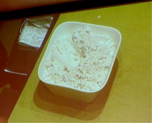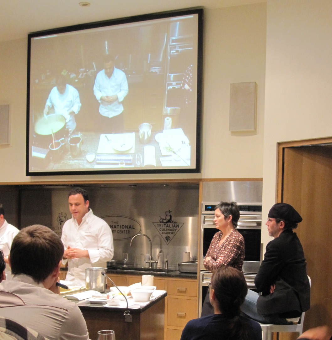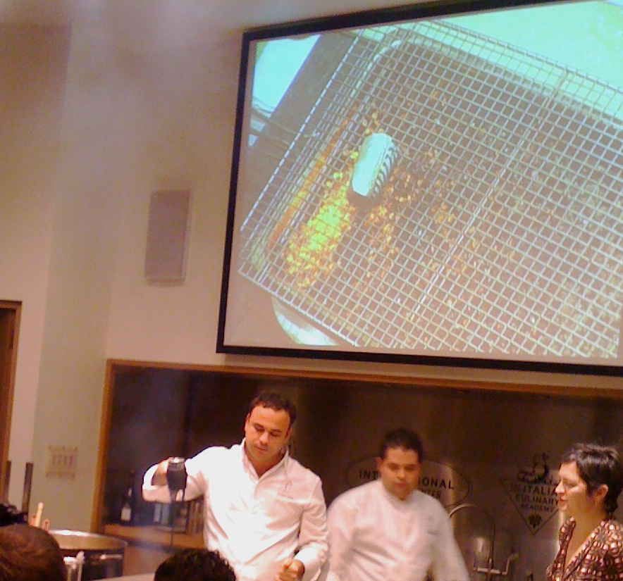 He then spoke about plankton, which they use for everything in his kitchen. He became interested in it but didn’t know how to get it out of the ocean. He decided to go out with a boat and use a special cloth that scientists use to get plankton for their research. After four hours he had only collected 2 grams of plankton, which, once he got it analyzed in a lab, was loaded with “everything from the periodic table.” So he decided to replicate the photosynthesis process and now grows his own, which he harvests every three months. Plankton has 30 times more omega 3s than olive oil, Chef León said. He makes a sort of liquidy paste with the plankton (lyophylized here because he had to transport it from Spain, but usually fresh), mineral water, xanthan gum, and a pinch of salt. That liquid can be used as sort of an instant fumet, by mixing some of it with water and a little bit of thyme. He demonstrated that particular use in a seafood risotto that is very typical dish of Andalucía.  He serves his version with clams from his area (he demonstrated it with oysters here because the clams are not available but said that they are not quite right for the dish, for taste and texture reasons) and egg white whipped with citric acide and lemon. The fumet and stock (he used both terms and I don’t know if it meant that in this case the traditional dish uses both—the translator was excellent but that part wasn’t clear to me) for the traditional dish require a lot of different varieties of fish and seafood, and must be made at least several hours ahead. He uses plankton instead, which is ready in seconds. The rice was first cooked with squid parts that are not presentable at markets because they are torn up and presumably some sort of fat and other aromatics. That part was done by a sous chef while he talked about something else. Plankton loses a lot of its characteristics when heated. It can’t be added to the risotto over heat because it is very rich in proteins and will coagulate. So once the rice is ready, they take it off the heat and stir in the plankton “fumet.” Chef León likened that to finishing a dish with butter, which gives it a familiar onctuousity. The “raw” plankton paste, which we sampled, has a very strong, yet strangely enjoyable flavor but the cooked one is more “commercial,” to use his term. We sampled the risotto, which was as good as any traditional seafood risotto I have ever eaten. The flavors were multi-layered and rich and the consistency perfectly “creamy.”
