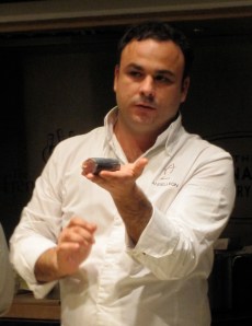 This afternoon, Blue Hill and the French Culinary Institute hosted a demonstration by chef Ángel León of Aponiente in El Puerto de Santa Maria, Andalucía, Spain, featuring his work with products from the ocean. León is the son of a fisherman and serves creative seafood preparation in his 25-seat fine dining restaurant, inspired by the great knowledge of the sea and its products that he gained going fishing with his father from an early age. I haven’t attended many modern cooking demonstrations about fish and seafood, so being able to learn from such a master, who is also a clear, organized, and charismatic speaker, was a truly special treat.