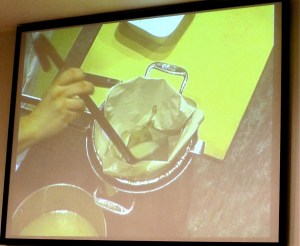 I missed the very beginning of his presentation because I was stuck in a meeting, so don’t know exactly how he started it, but he was cooking fish over an olive pit charcoal fire, which he was heating up with a blow dryer (he presented that with Chef Andoni Aduriz at Madrid Fusion in 2008). Olive pits are abundant in Spain and make for a clean burning charcoal. I think that the fish might have been the mackerel prepared in the process described above but can’t be absolutely sure. He gave the above explanation afterward, but the fish he was cooking when I arrived looked just like the one he then sliced to serve sashimi style. We didn’t get to taste the fish cooked over the olive pits, but he said that it picks up the flavor. He used the same fire again later in the demo and just restarted it with the blow dryer.