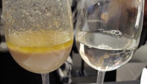 Chef León then unveiled a machine that had been covered with a white cloth until then, something that he has been developing with a technology company in Andalucía for both home and restaurant use. He is very interested by “cold,” he said, and does work in that area, without using liquid nitrogen in the restaurant, however. Inside this machine is a liquid made of all-natural ingredients (he said we could eat it) that circulates and chills things very rapidly. The liquid is of course proprietary and he didn’t reveal any further details as to what it might contain. The machine doesn’t have a temperature dial, only a timer. One controls the chilling process by deciding how long to leave something in the machine. Because his restaurant is small, they don’t have much storage space. Having this machine allows for white wine to be chilled a la minute rather than being kept in refrigerators, which is necessary in a region where temperatures average 40 C in the summer. His sommelier also said that he didn’t like wines staying refrigerated for too long. With this, they can take a room-temperature bottle of wine to chilled in 2 minutes. They can also instantly make a bottle of wine colder if a diner requests it. The machine he showed only had one hole, for one bottle at a time, but the one they use in the restaurant has four holes, which each have their own timer. It’s great for a tasting, the sommelier said. Chef León started using the liquid to chill stocks by dropping plastic bags of them directly into it. The machine can also be used with solids; he freezes an apple, for example, and then shaves it onto cheese.