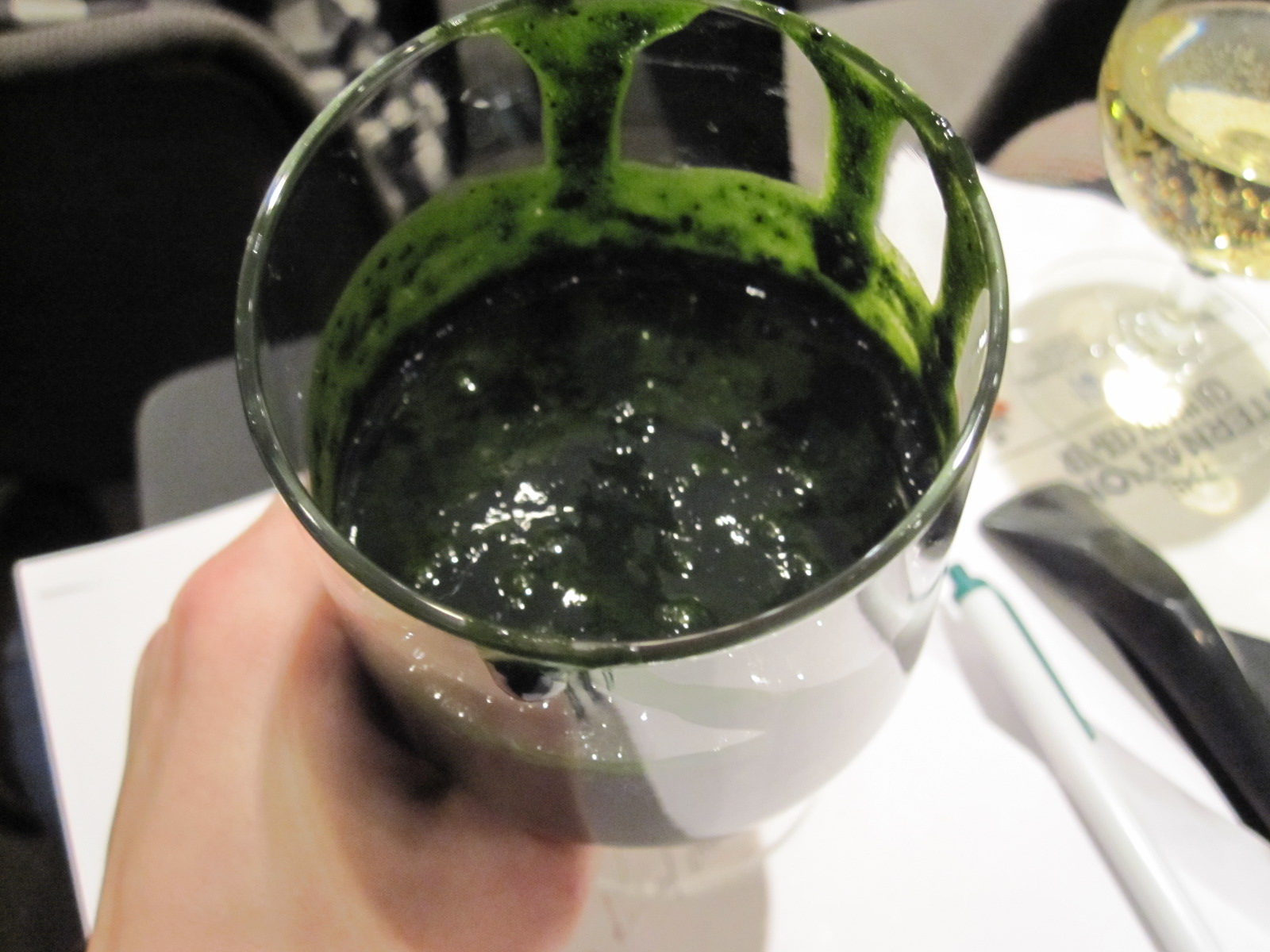 Then he moved on to micro algae clarification, which he developed into the Clarimax machine. He wanted to work with algae and did his own chemical analysis of them in his kitchen. He then developed a flour-like product from those micro-algae. He made a very murky broth (which can be meat or fish) and added some of that flour to it. Then he passed it once through a chinois lined with thick, brown paper (the one very often available in kitchens and used to wipe hands and counters alike). The resulting broth is completely clear. That process doesn’t require any heat and no flavor is lost. He buys that micro algae powder from a purveyor but said that it was nearly impossible to obtain.